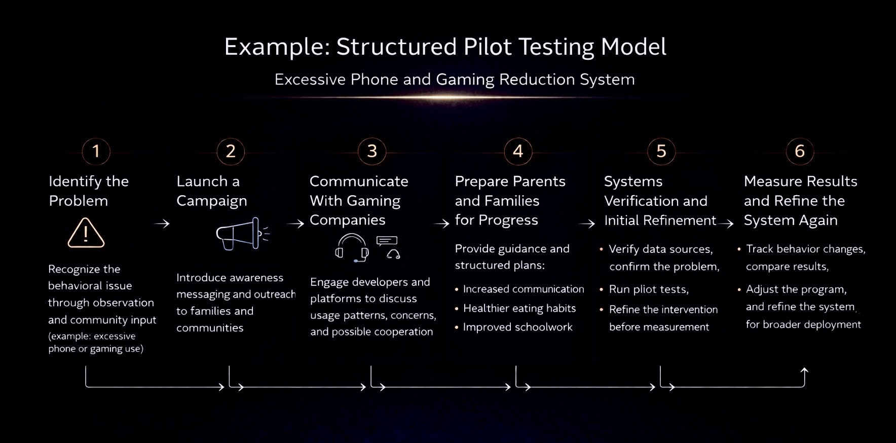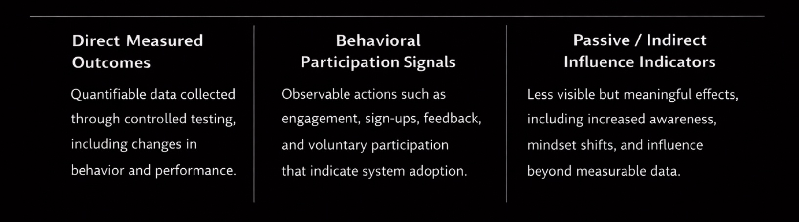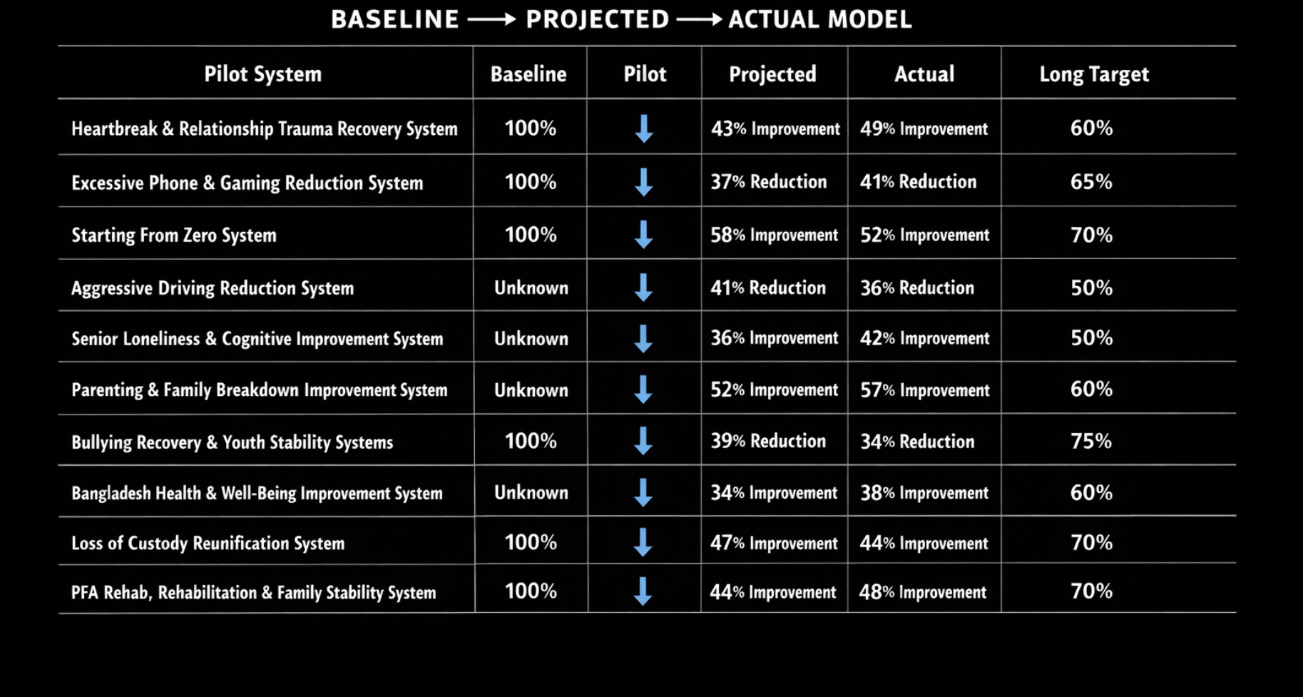 Pilot systems track measurable indicators including behavioral change, participation levels, and overall stability. These indicators provide a structured view of how individuals and systems respond over time within each pilot.